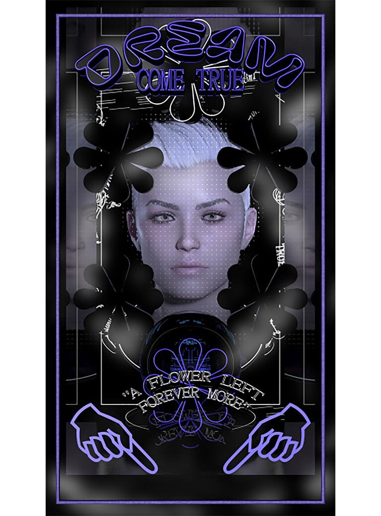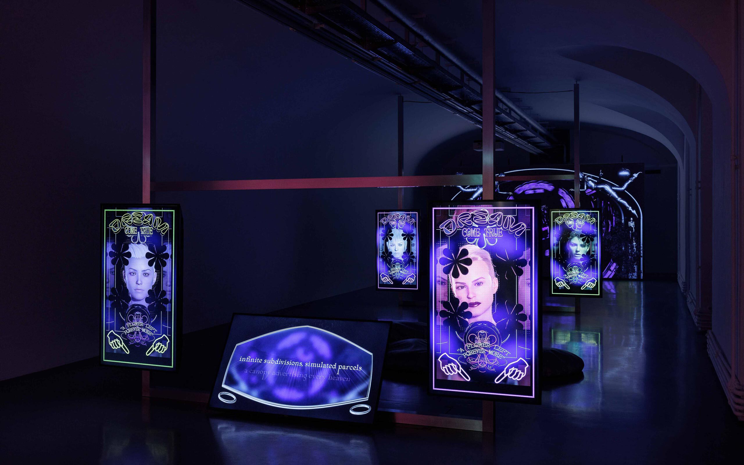Pardon Our Dust is a multi-channel installation, expanded through a large room of the MAK through the use of rigid metal framing and six display panels. Constructed as a loop, the work weaves in and out of the many possibilities created by simulated worlds. I look at many of my simulated works as navigable poems, enriched by using game engines and time-based media. The work can be read as a poem, or you can enter the work entirely at the MAK. One detail of the show that may not be known is that the four versions of myself appear as “flower collectors”. As the sort of inverse to an advertisement, they appear in different scenes with symbol hands pointing at the floor, hoping that physical flowers will be left beneath their frames. Whether or not the public takes this suggestion is a reflection of the time in itself. Would you leave flowers for an avatar? Will a generation from now? After that?