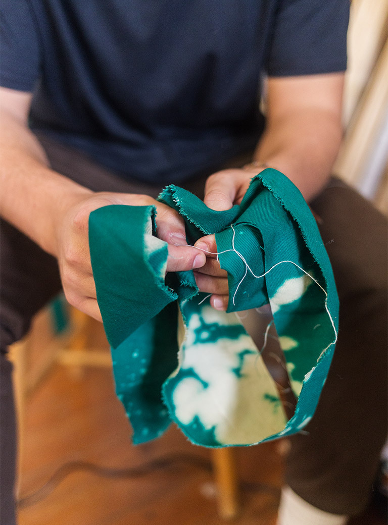 Young Portuguese artist Manuel Tainha studied with Anselm Reyle in Hamburg before returning to Portugal – not only for the sun, but also for the bleach and his mentors in the country’s old laundry shops. In his studio above Lisbon's rooftops, Manuel sews together patches of dyed or bleached cloth to create gestural paintings that seem to follow a primary, natural and organic impulse. The embroideries he often adds evoke the notion mysterious traces, as if left by some magical dance.