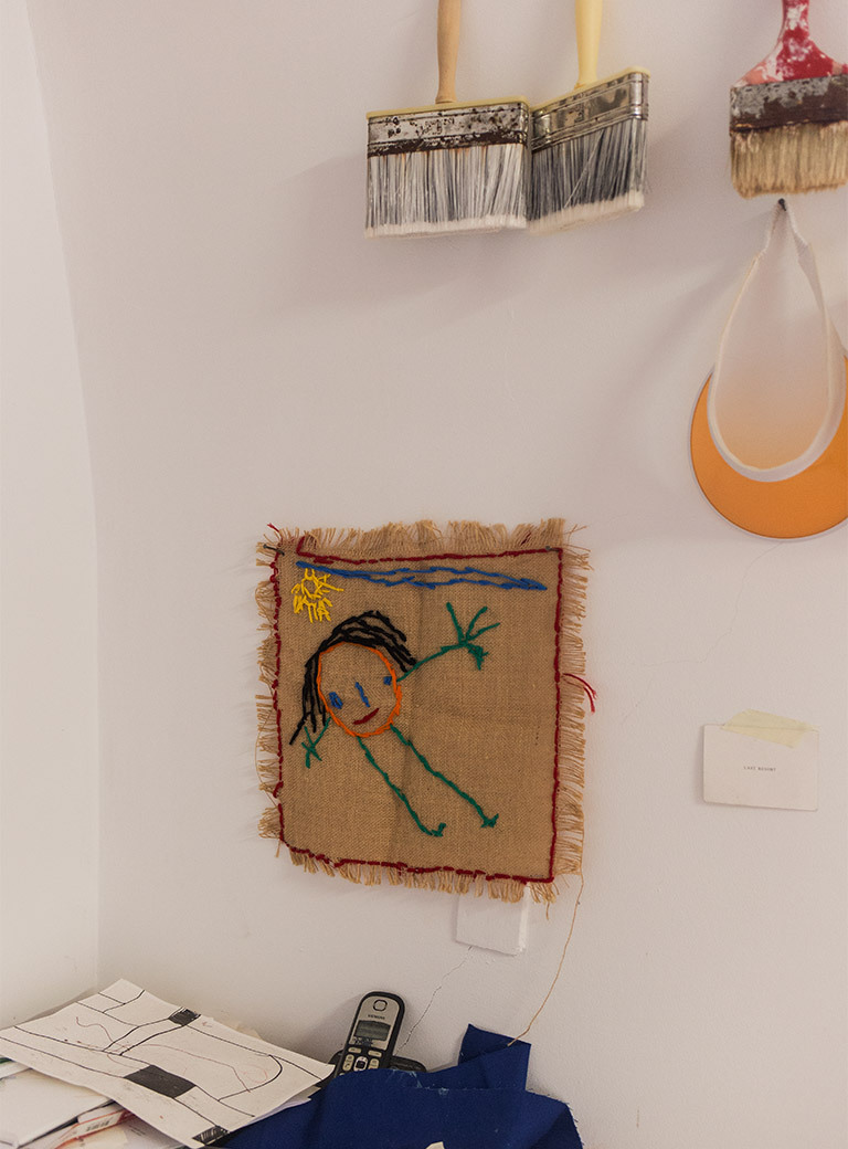 Oh, it’s this one! (laughs, and shows a stitched drawing on the wall). This was my first artwork from ’97 when I was four years old. I just found it as I was moving into this studio. As this is my father’s house it also has a lot of memories from when I was a kid. When I discovered it again it made a lot of sense because I was starting to do these serious (stitched) drawings. Back then this wasn’t on my mind, obviously. It was an exercise that every child had to do but yes, that is probably the first artwork. It’s still my best one. I truly believe that.
