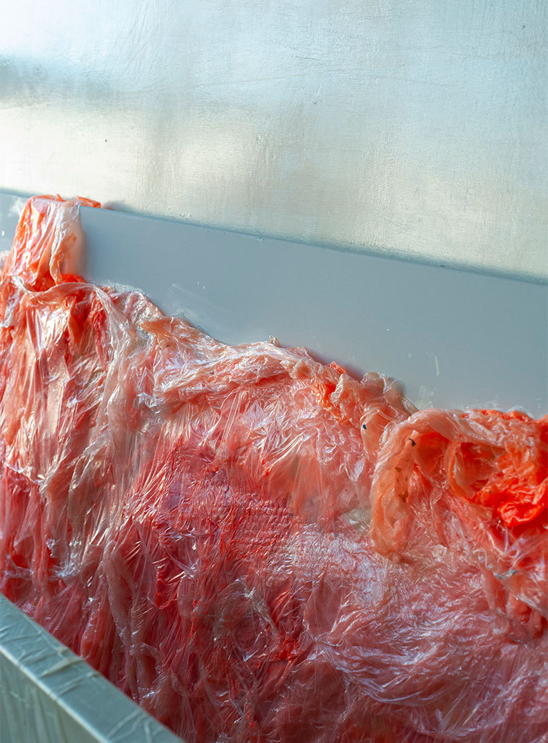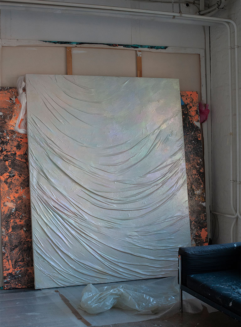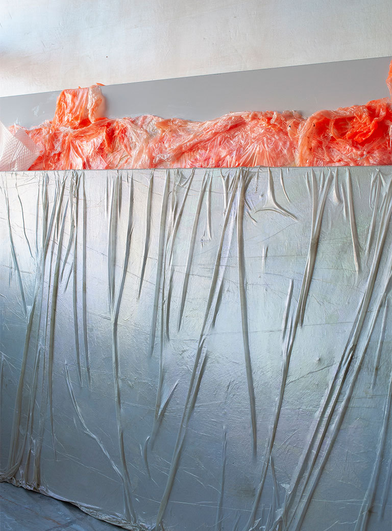 It’s all about communication. I create a performative space that people can project onto. For instance, when I make these folds with acrylic paint people think that it’s real plastic. I seduce them into seeing something familiar, but not necessarily definable. The paintings are in the viewer’s experience, the result of a combination of material illusions and confrontations with the viewer’s own projections.