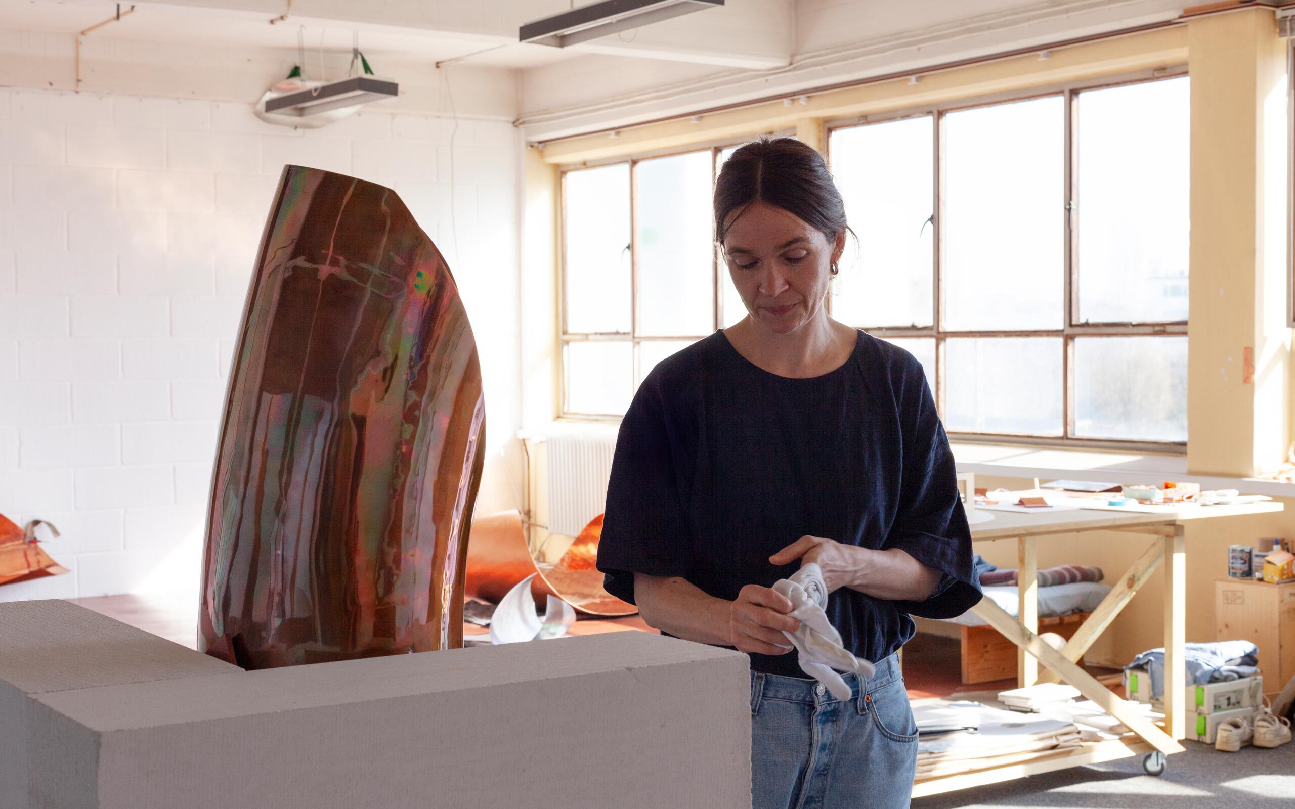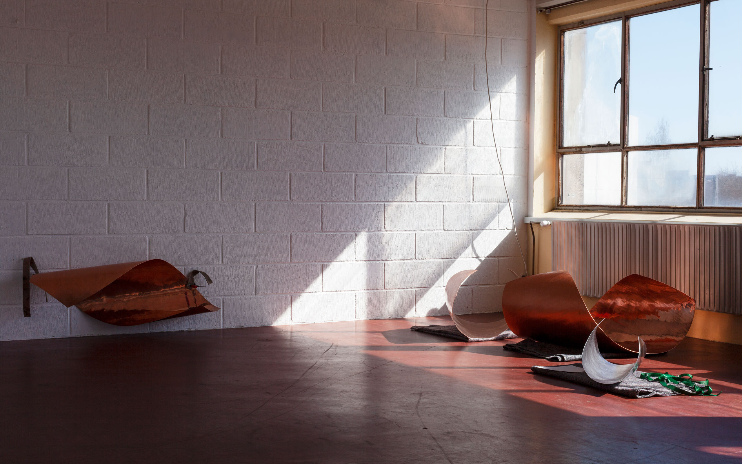 It is in the negotiation between the qualities of the material and the intention I apply that the shaping of the material happens. In the shaping of copper, for example, I explore its strength and flexibility more deeply by heating it up, hammering, stretching and compressing it. I’ve been working with something called an English Wheel, traditionally used to make vintage car parts. It’s a mechanical process, in which you tighten these two wheels that apply a lot of pressure when you roll the copper in between them. And through that repetitive movement combined with the pressure, it enables one to stretch and shape the copper. I do enjoy the physicality, as a direct encounter, and as a consequence of coming up with something, having to work the material, spending the time and investing myself in it.