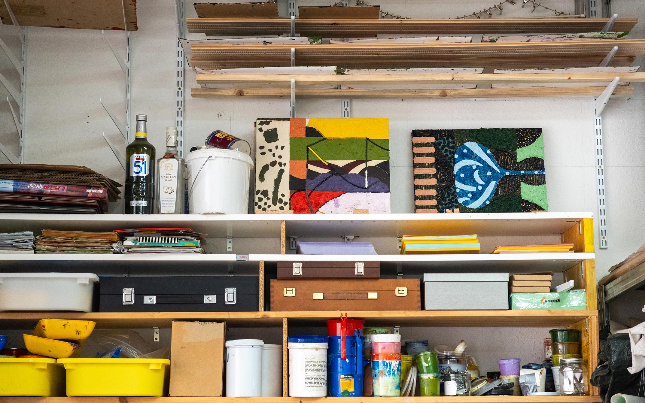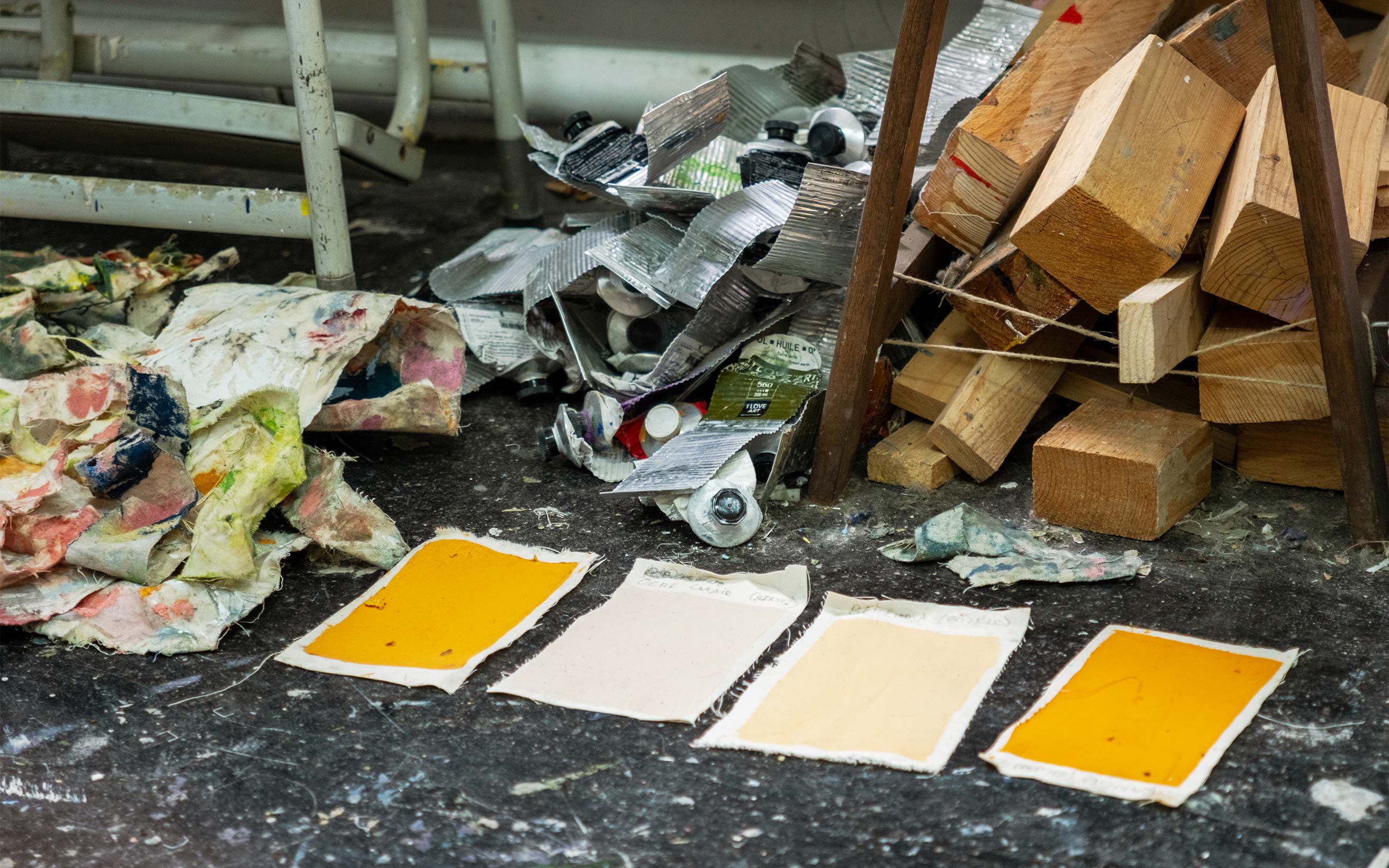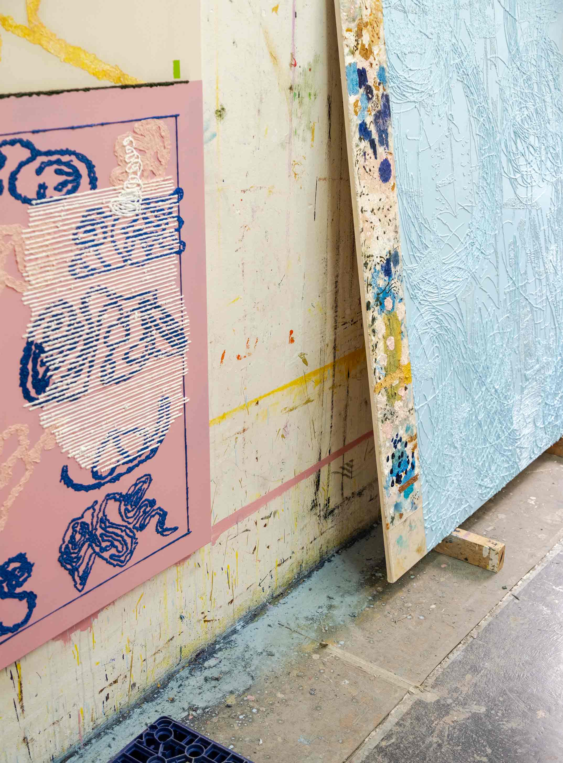Probably still painting, even though I work with the means of a collage. In my studio, I have created an ecosystem. There is a place where I keep old, cut-out pictures, another where there are rags on which I dry my brushes, and another where I store notes or drawings which I created along the way. This is a constantly evolving archive and pool which I can come back to anytime. All this adds up to a pattern and allows me to mix up old and new, like a remix. For instance, in this blue painting on the wall over there, the fabric strip on the left side looks like a painter’s palette… The strip was created separately, and I only later collaged it onto the canvas - as a way of marking the beginning of the painting’s story. It relocates the painting in a different context because it reveals another part of the process: its origin. And the eye instinctively picks up the colour from the strip, feeding it into the otherwise monochrome image.