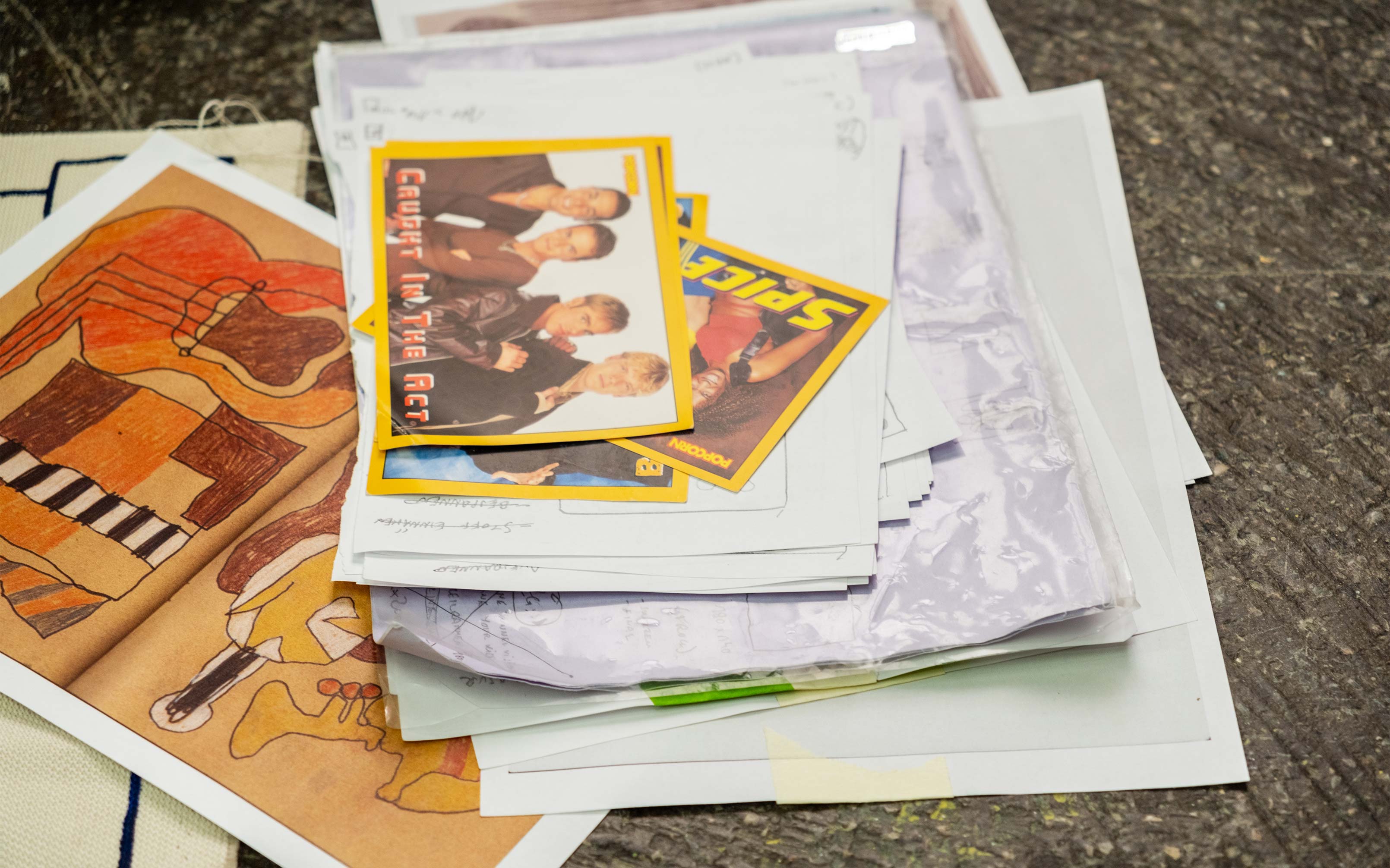 I collect mainly books, fabrics, and lots of pictures. For instance, this old card with the Spice Girls, which you are looking at right now - it comes from a magazine, which I found on the street during a house clearing. And the fabric which you are sitting on right now comes from an old, abandoned church.