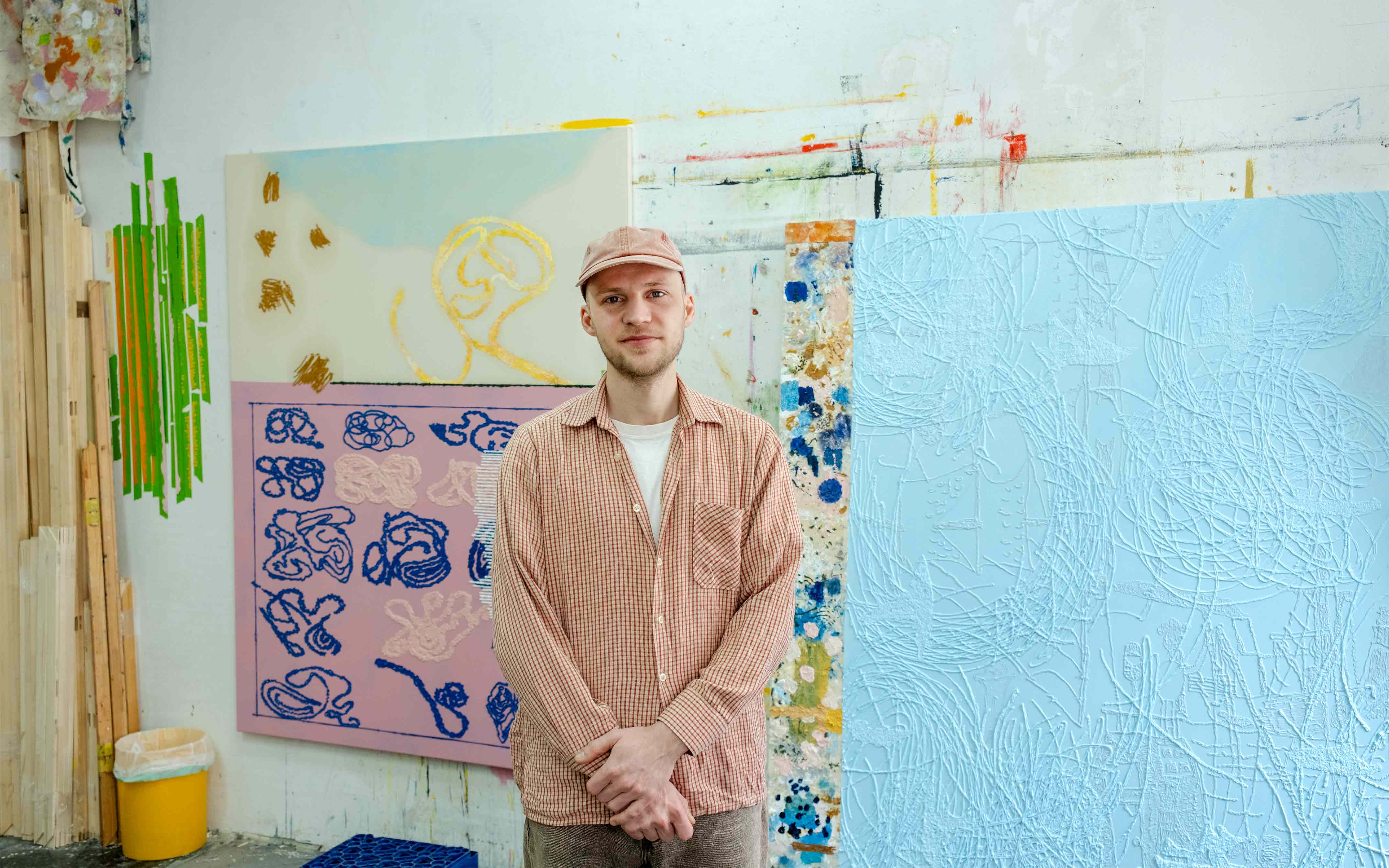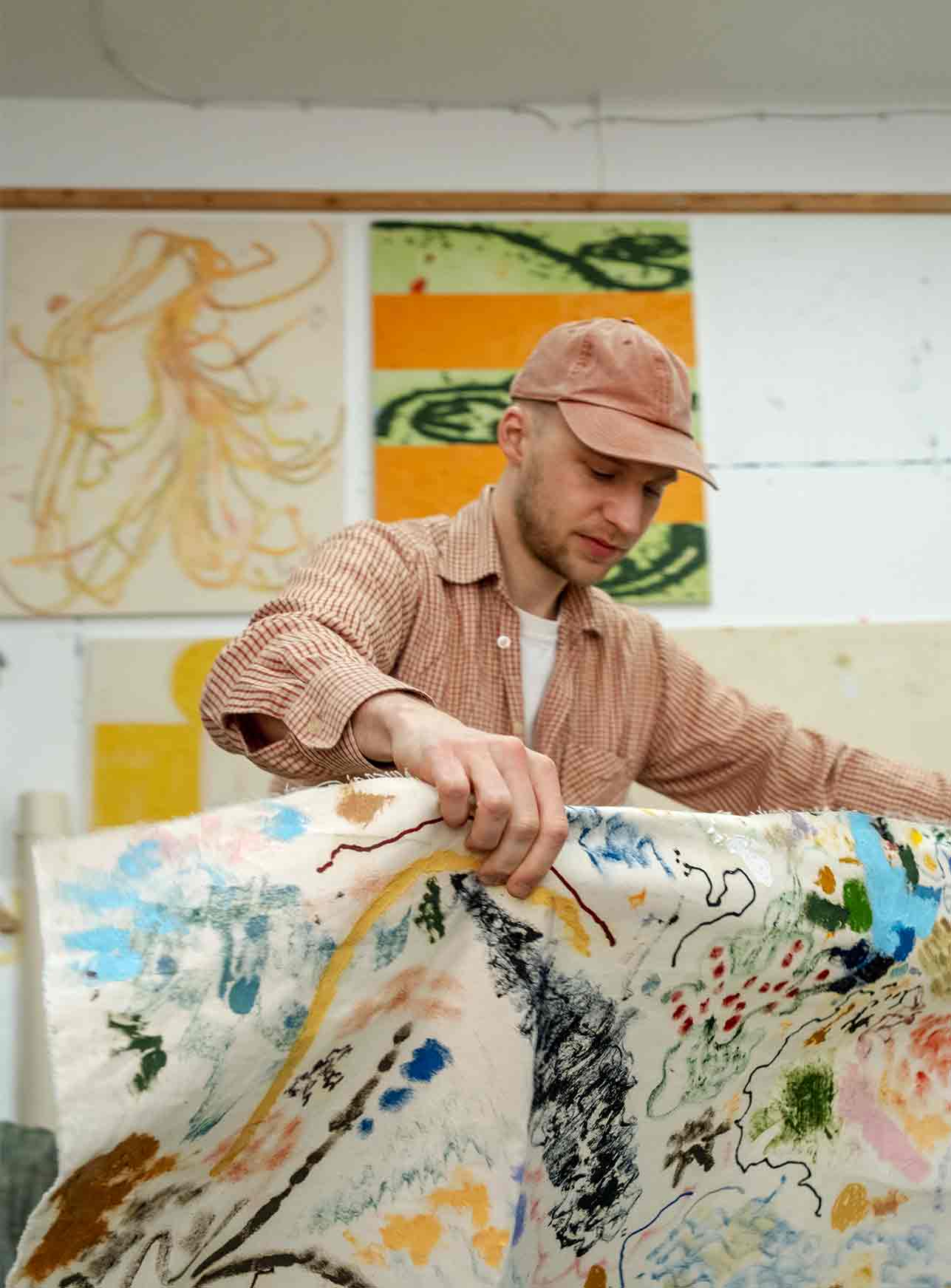Max Freund is not satisfied with just one way of expression: he draws, paints, sews and collages. At the same time, he runs a publishing house together with friends, in which his interest for graphic print comes to show. In his work, figurative painting meets abstract shapes, and both are equally important to him. His inspirations come from music and literature, as he translates their rhythms into art.