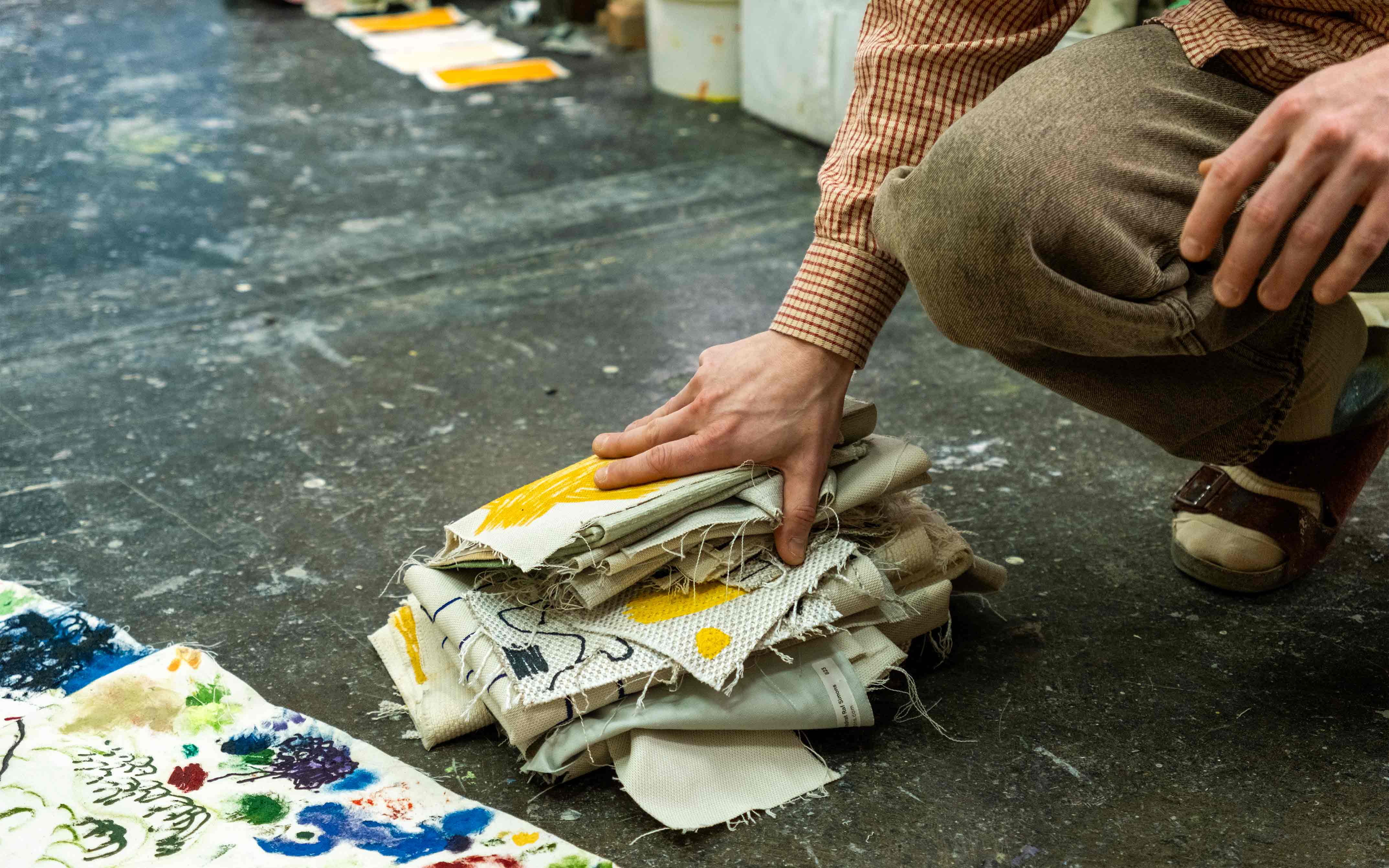 Yes, due to shortage of time, I was working directly on the already upholstered chairs. It was a challenge, but a beautiful cooperation. I had tried out different fabrics, how the colour acts on them. As a painter, one usually uses the classic primed canvas, but with some fabrics, the way they are woven or the colour sets is different, and I really love that.