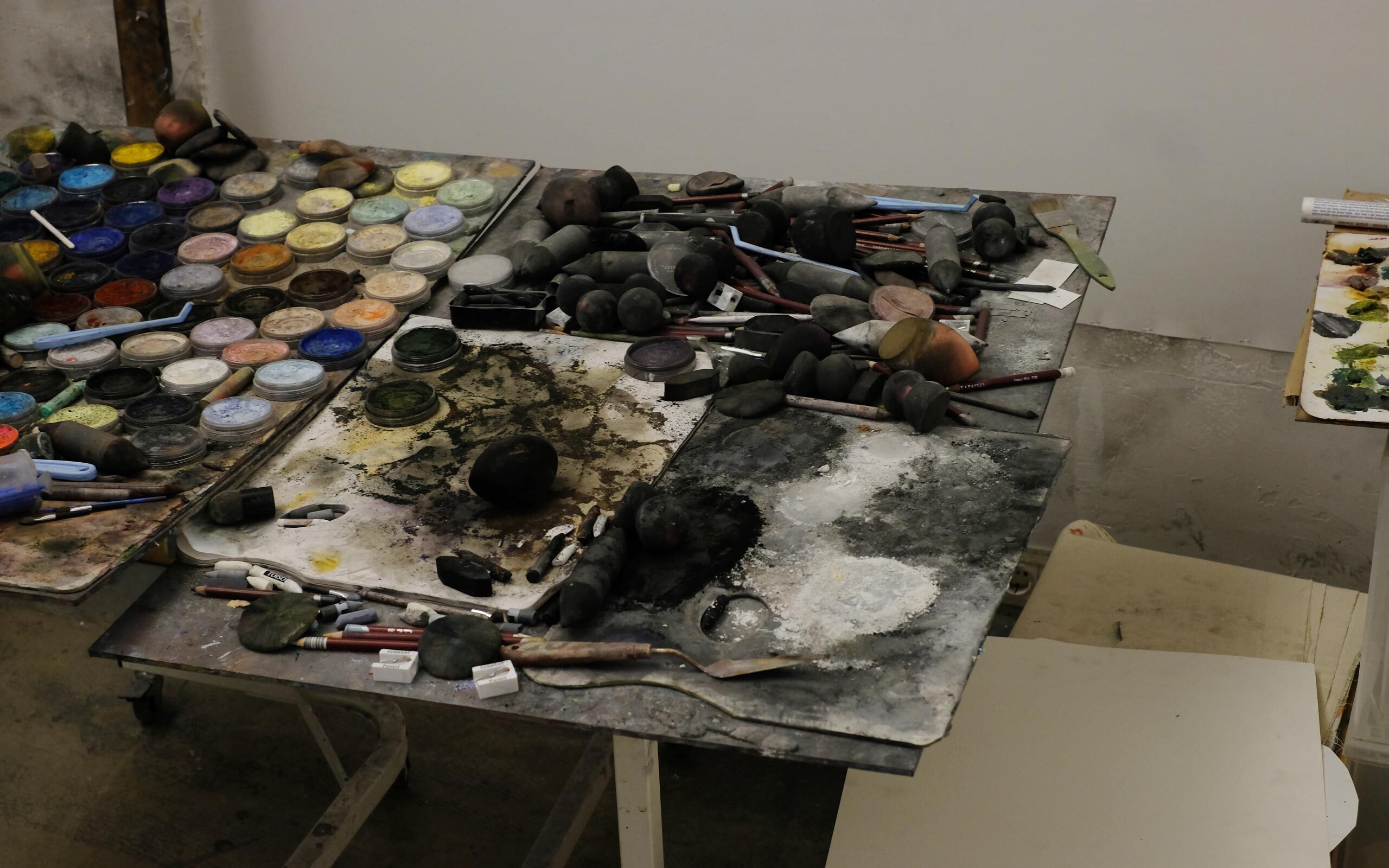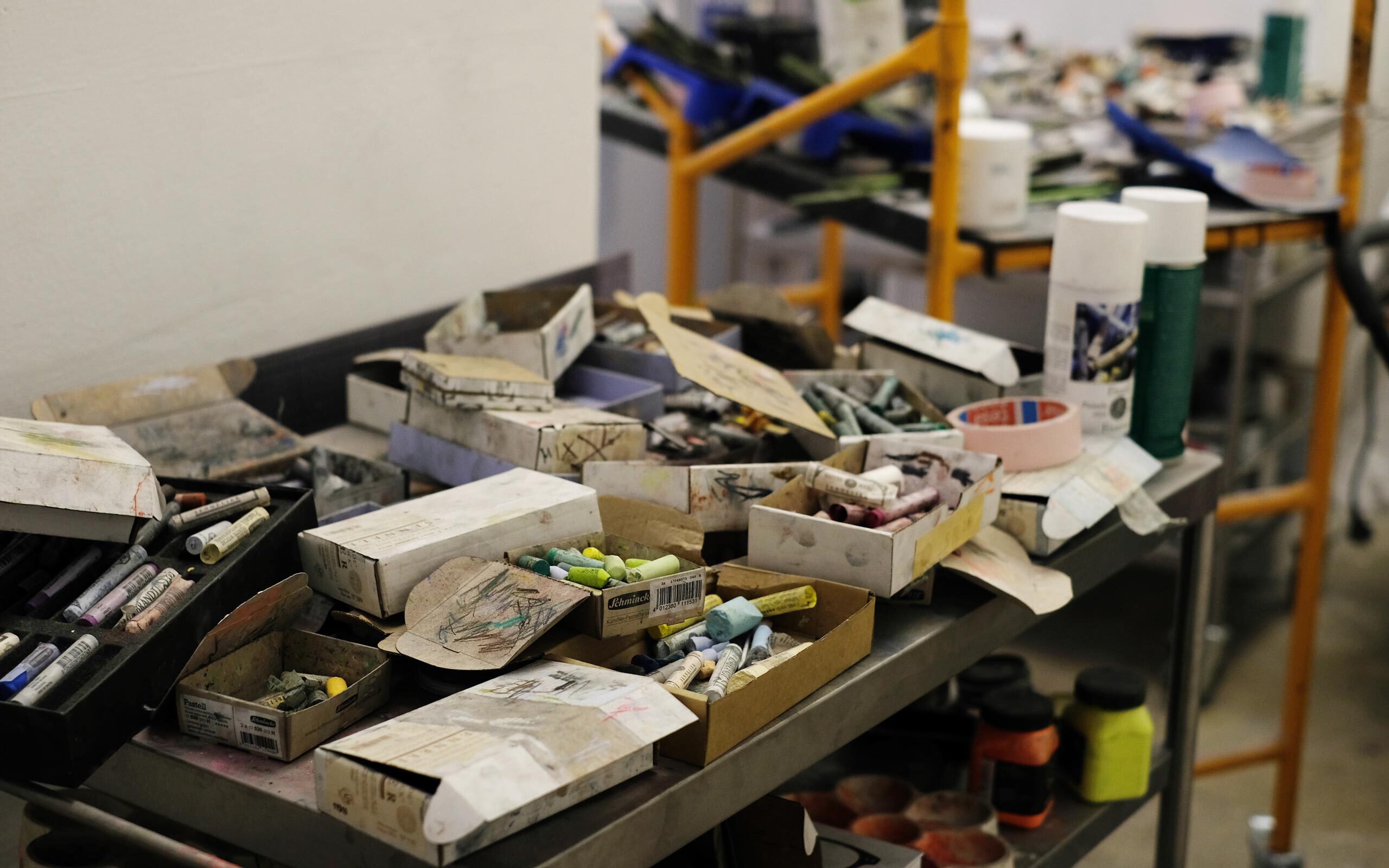 A: We did a lot of experiments and developed our stroke together. About seven years ago, we developed our own form of mixed media, combining oil and pastel chalk in a novel way. The powder character of the chalk enhances the reflective power of light and acquires new intensities of illuminative effect.