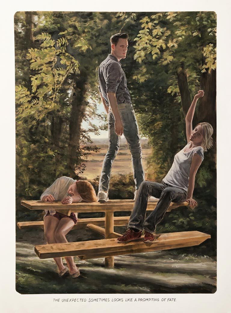 A: We are almost always working, researching and creating the image compositions on the computer is as much a part of the working process as the actual painting itself. We also deal with the many time phenomena on social media, how people represent and see themselves. These various streams and appropriated images are sources for image compositions. But we also do our own photo sessions with models in the studio and create our own staging. When we decide to paint a picture, we have a framework idea of the scenario, an assemblage of different images.