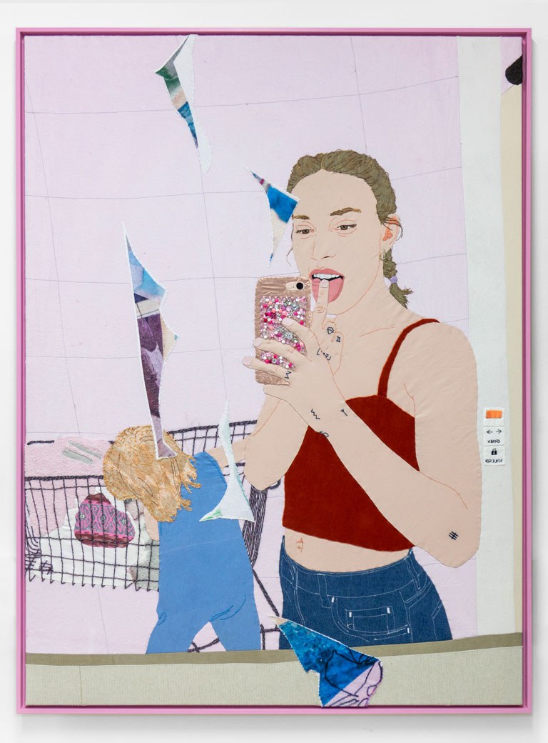 shopping mall selfie, textiles and embroidery on canvas, 2023