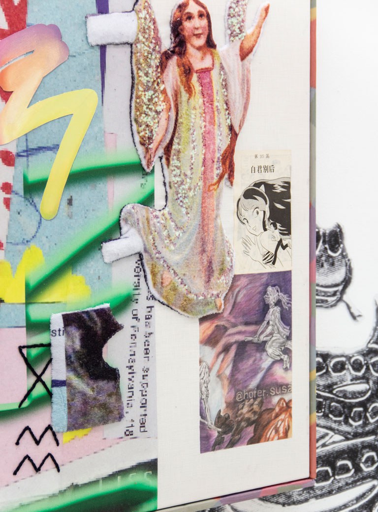 In her colourful and complex collages, visual artist Nana Mandl merges analogue and digital images to create multi-layered works of art. By incorporating elements from both personal memories and collective cultural references, Mandl’s works bridge the gap between individual experiences and broader societal narratives. The tactile nature of her art, including embroidery and textile manipulation, serves as a contrast to rapid digital image production. In this way, Mandl offers a unique perspective on the intersection of personal and cultural memory in the digital age.