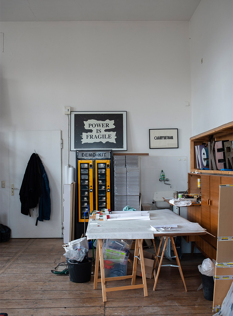 The Backpacks belong in this context. Ultimately, they are not so important to me as action, but rather because they activate thoughts and offer possibilities. You can borrow them, you can go out on the street with the speaker’s backpack or with the demonstration backpack – but you don’t have to. As soon as the Backpacks are on the street, they are no longer art, but functional objects. It was important to me to create a platform to react to and to act on. My actions are also about questions that the visitor is confronted with: “Do I want to do this at all? Do I have the courage to do that – and also the strength? Do I have anything to say at all?”