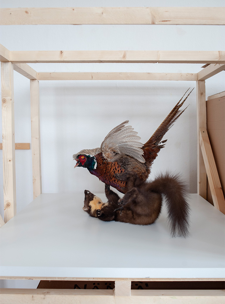 Of course, I'm political. I am a political person, not just a political artist. I think politically, my commitment is political. Perhaps not in political parties, but in relation to being a critical voice within the political confusion in which we find ourselves, and also to taking a stand through my artistic work. That doesn't mean that as an artist you have to say which party or agenda is right or wrong. It always depends on how you position yourself as a human being. In all my works, including my current work Agony (2018), I'm concerned with the social body. Agony is a strongly metaphorical work and a kind of expression of resistance, a “not wanting to accept” given laws. In this case, the dove triumphs over the falcon in the agony of dying, the fawn over the fox, and the goat over the lynx. This way, images are created that encour-age people not only to conform within systems, but also to resist in order to change the sys-tem. I am always interested in an anthropological and sociological approach. “How do we live? How do we reflect?” This happens from a point of view that is clearly critical. And this critique means nothing other than being political. We live in Germany, there is no war here. We live here like maggots in bacon, even if you have little money, you live relatively well and don't have to fear for your life, here unlike in many other parts of the world, I don’t im-mediately get locked up if I do a critical artwork; here I act from a very privileged position, and I am aware of that.