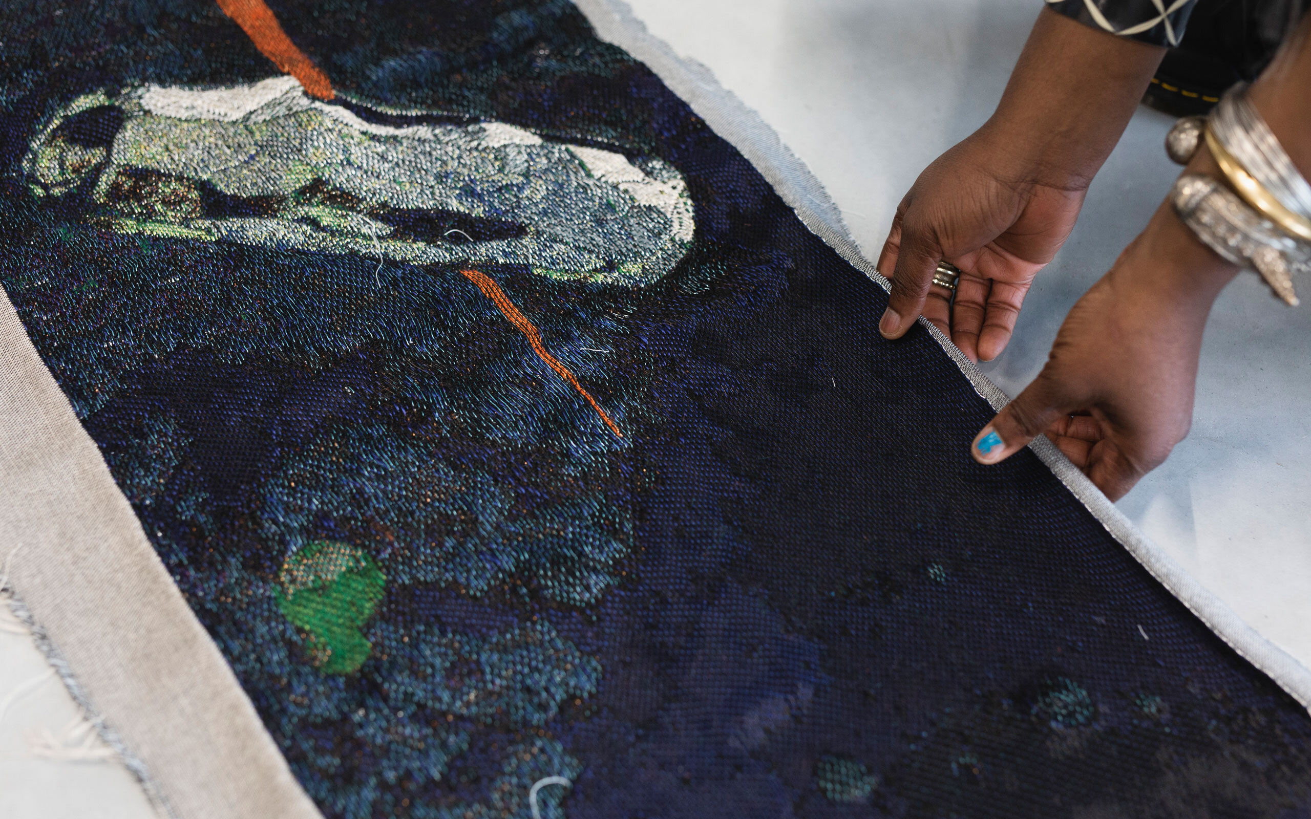 Within my work in general I think a lot about the interconnectedness of things. When you see the tapestry, it goes from deep sea to landscape – one cannot separate what happens in the abyss of the hadal zone from what happens on the sea surface. The way the oceans are cooled by the flow between the Arctic and the Antarctic regions affects the climate, which is not stable. It’s important for me to work on the correlation of worlds that are visible to worlds that are not. My works move between the non-visible and the non-tangible to places that are concrete, places that awaken the senses: touch, smell, sight, sound. At the same time, coming from a world within the African continent – I’m Nigerian originally but now also Belgian – I realize that information here becomes very visible when there’s a big story, with many deaths and so on, but at the same time there are so many stories that we don’t hear even if they’re strongly connected to Belgium. It’s this separation that allows for us to believe that we’re different, that a certain culture or space has nothing to do with where we are living at that moment. Human beings have hardly any understanding of other places unless they really move or go visit and see and have a physical and emotional connection to them.