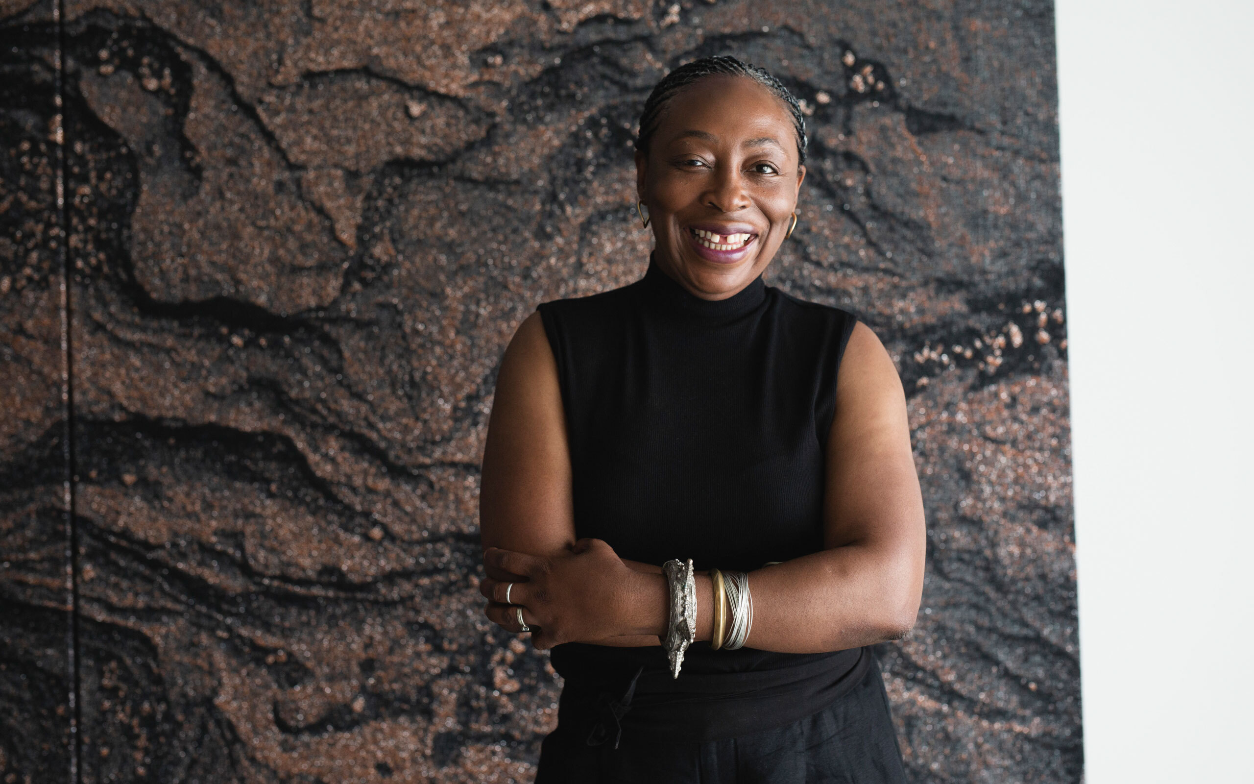 Visual artist Otobong Nkanga is a global citizen raised in Lagos, who has lived in Paris, Amsterdam, and Antwerp, and works with people all over the world. She enjoys a particularly broad and informed perspective on the planet. As an artist, but mostly simply as a human being with a physical body located in space and time, she relates to global circulation and production in local ways that are fully embodied in her art practice.
