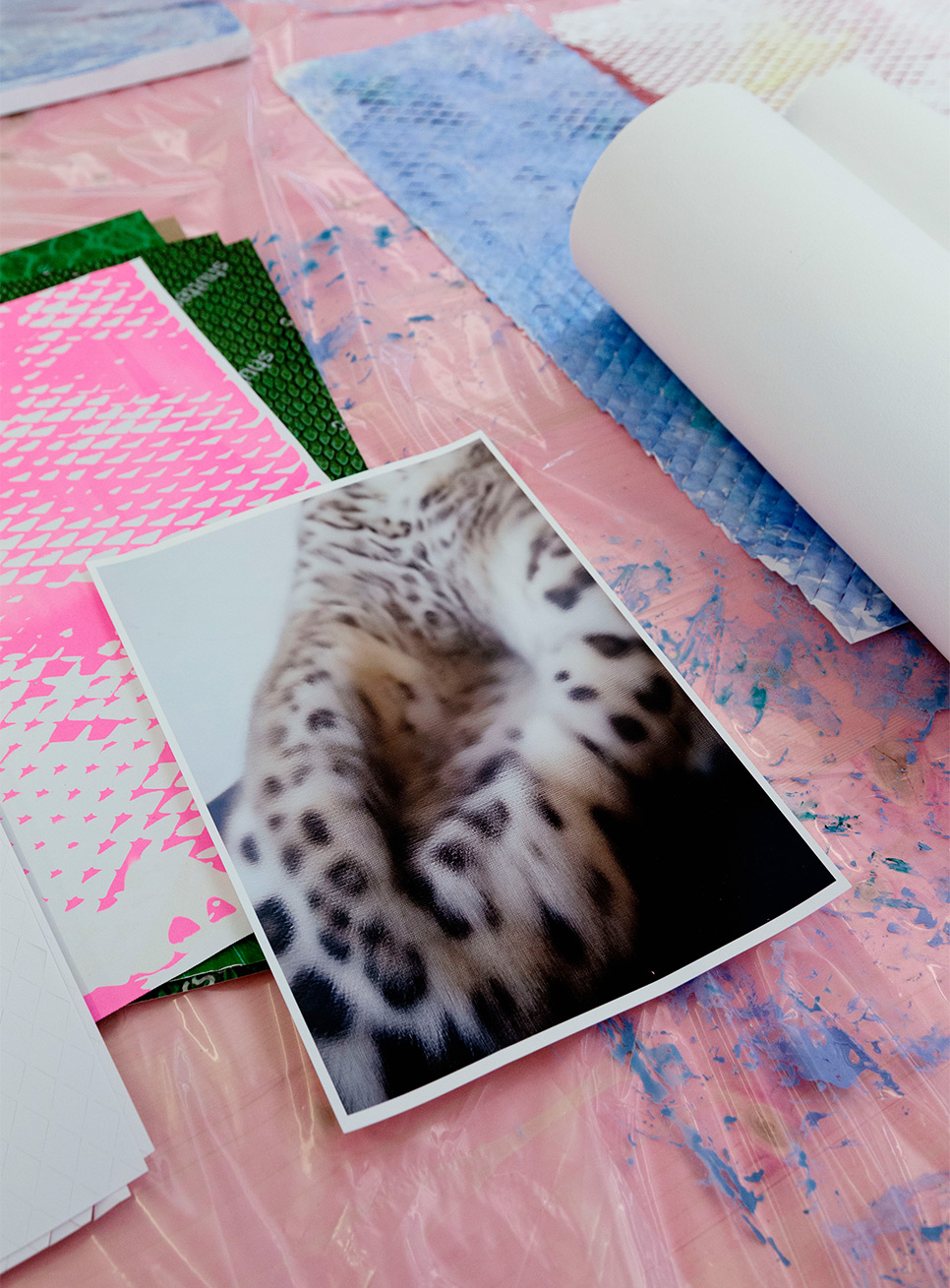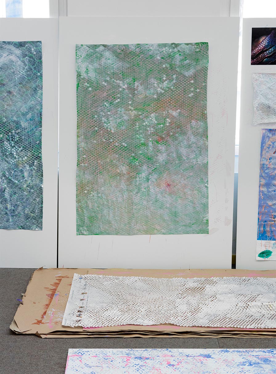 One focus is a new generation of Healer Scrolls. In these works, I combine forms of AI image generation with a very physical, seemingly alchemical, painting process. The images often begin with prompting dreamlike scenes – such as animals that only appear to be real but are humanised, interacting with food or language – and then translated into membrane-like paintings, which I then paint. The surfaces are structured like skin cells or codes. I am interested in how algorithmic image production, archaic symbolism and a very material painting can come together in a single object.