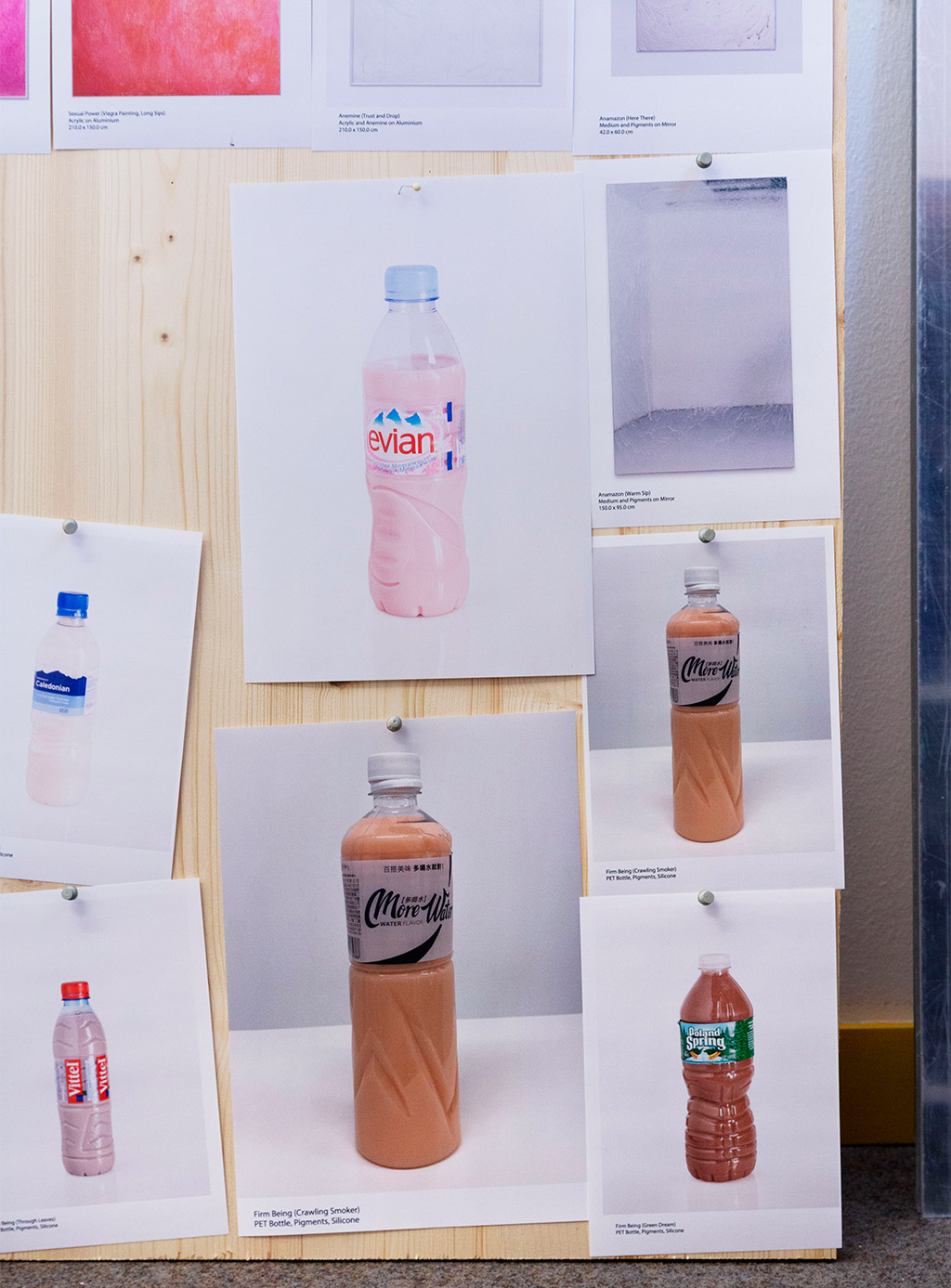 This reflects a similar interest in ideas about the body. Brands like Fiji advertise with ideas of being pure and untarnished – ‘Untouched by Man’ or ‘Uncompromised by the Air of the 21st Century’ are their slogans. At the same time, the water is bottled in plastic, which in turn releases questionable substances. In my work, I replaced the water with a silicone mixture containing pigments, the colour of which is reminiscent of various shades of human skin. The monochrome colour becomes a quasi-human volume that fills the bottle and short-circuits as a product.