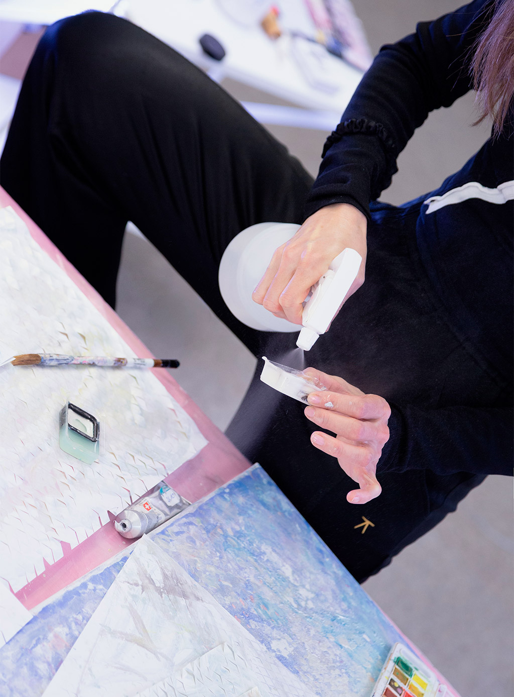 The question of a boundary between nature and artificiality. I doubt that this boundary exists. Rather, everything is natural, even what we consider artificial or synthetic. Today, we are gradually beginning to understand much more about how our ‘natural’ bodies are already permeated by hormone-active components of synthetic chemistry that we have been absorbing for around a century. In my work, I try to make such contradictions sensually tangible, for example through pigments reminiscent of human skin, through liquids, smells, light or with AI.