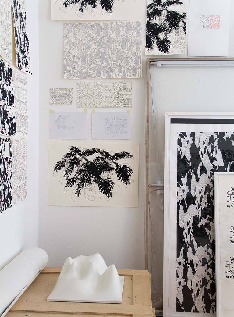Yes, they really are. I spend incredible amounts of time in front of large pieces of paper like the ones hanging on the wall. I love to sit here by myself listening to an audio book and just drawing. This detail-oriented way of working is very meditative. Despite my very structured way of working it can happen that I am so immersed in my work that I suddenly notice that it is almost noon and I haven’t yet brushed my teeth. (laughs)