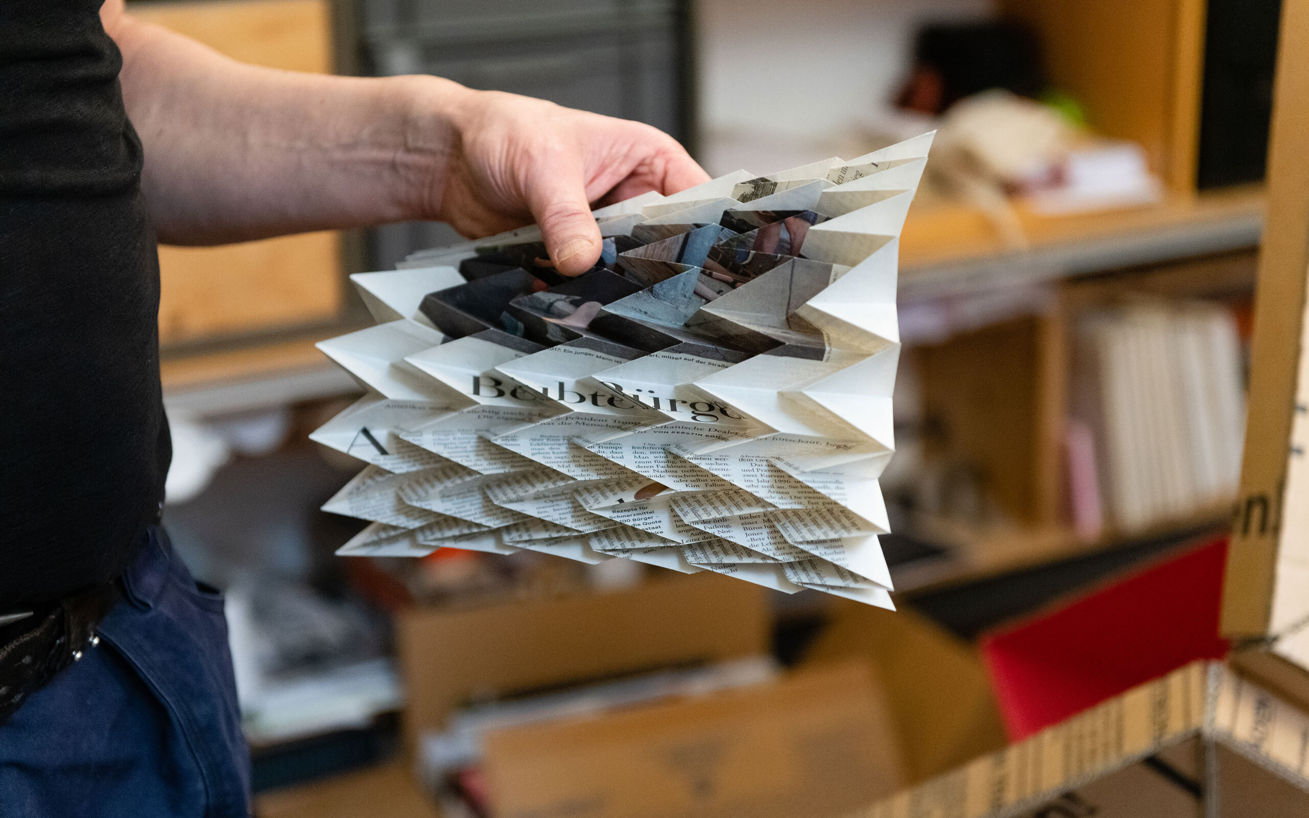 Art is about awareness, situational awareness, which directs perception to another level. The House with Eyebrowswas intended by me from the beginning to appear in such a way that you can’t see from a distance that the facade is contemporary. At first glance, it looks like a typical Gründerzeit facade. Only when you get closer do you recognize the triangular surfaces. This transformation of perception interests me. I would like to acknowledge that as an important moment in my work. This also applies to the origami inspired works. From a distance, they are triangular surfaces. Then you recognize the newspaper sheet and ultimately the article. These steps of perception are what I aim for. Through this, people can experience a certain enthusiasm because something happens to them.