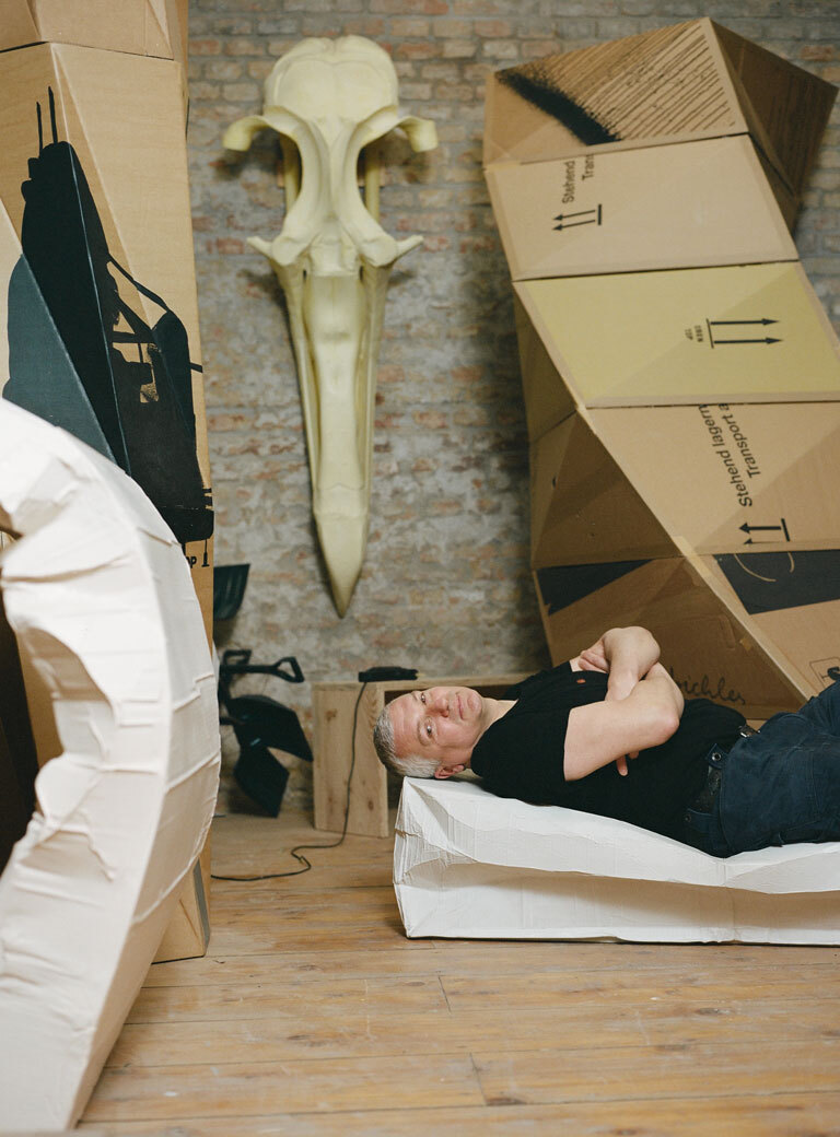 The Tyrolean-born artist Peter Sandbichler frequently uses cardboard as his source material, which he cuts, folds, and thereby into three-dimensional objects. His preference for modular systems is just as apparent in the large-scale sculptures that interpose themselves within a space as in his smaller-scale origami-like works. Sandbichler’s particular interest in the fold in sculpture is equally evident when he reaches for other materials such as concrete or metal. We talked to the artist, who is adamantly committed to recycling, about his idea of the studio as an agent of transformation and his unconventional ways of sourcing materials.