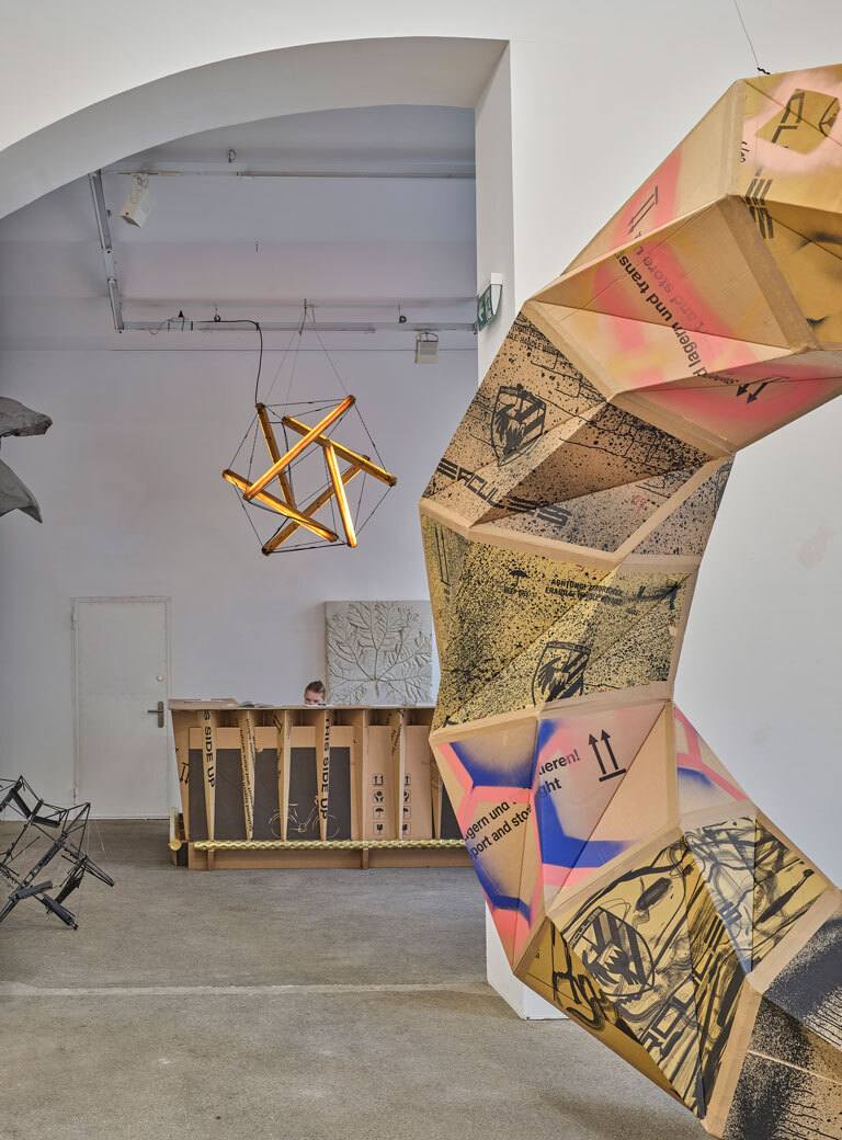 Here is an installation for the Kunstraum Dornbirn, it is a module of a horizontal spiral. We cut the modules out of bicycle shipping boxes that I get from the bicycle stores. Why am I building this with cardboard? Imagine it in any other material. Even if it was just plywood, it would cost an enormous amount and cause an insane amount of damage from an environmental perspective. Plus, cardboard allows for a lot more than other materials. I can’t fold wood. If I want to make it in metal, I need a bending machine. Cardboard, a ruler, and a pizza knife are enough.