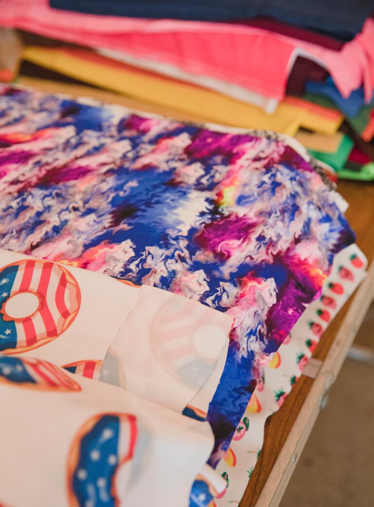 They are models of the spaces of my upcoming shows at Spruance Gallery, Arcadia University in Pennsylvania, at Magasin III Jaffa in Tel Aviv, and at Kunstmuseum Lucerne in Switzerland. So I’m working simultaneously on these different shows. The show at Arcadia is mostly ceramics. My idea for Lucerne is to make a huge crazy quilt out of all of these fabrics you see piled up in the studio. A “crazy quilt” is a quilt made up of scraps, or patchwork, with no repeating pattern. They are going to be two crazy quilts actually: One with solid colors and one with prints. Some of the patterns are just hilarious. There is one with smiley faces that drives me crazy. I buy up remnants from the fashion industry. It’s used for theatrical material, but also for bathing suits, gym wear, and skateboarders clothing. These synthetic fabrics lay very beautifully on the floor.