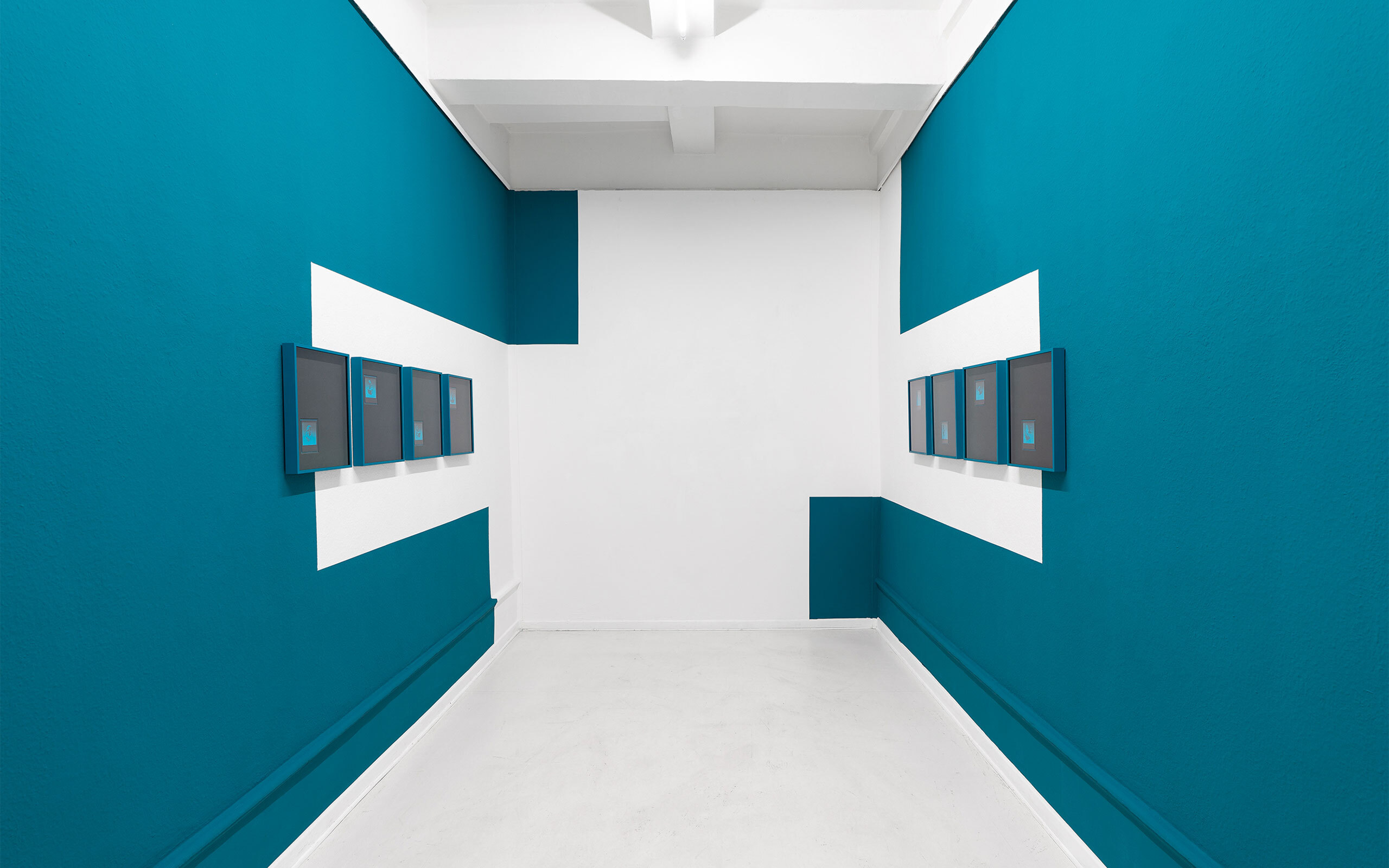 With the intervention and the settings through the wall paint within the exhibition rooms in which the works are shown, one of my aims is to make a leap from the pictorial space of the frame into the factual space. On the one hand, I play with finding out how the spatial and color interventions influence the paintings and whether this negates something or creates a new, unique relationship between space, pictorial space and work, which I would affirm in most cases. A kind of correspondence between pictorial space and exterior space can emerge. On the other hand, I am also interested in questioning museum settings – in other words, critically pursuing the idea of the built space for art and its staging by using similar strategies and referring to them. For it cannot be denied, of course, that such settings, whether within a museum or a gallery exhibition, bring with them a certain dominance and can be a staging that one could perhaps critically describe as “too pleasing” or “eye candy”. Nevertheless, this also repeatedly raises the question: “What is it that is actually brought together there?”