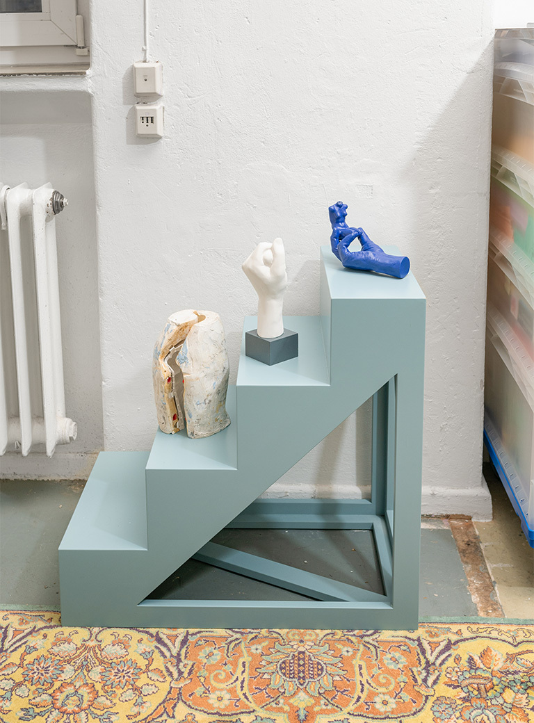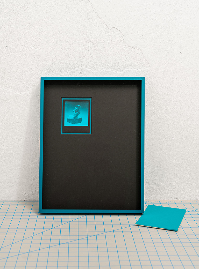 I purchased a bronze copy of the hand sculpture, inscribed “after Rodin”, from an online art dealer, and so another aspect was added to the confusion of attributions. To negate the pseudo patinated bronze, I used a dark blue plastic spray in a gesture of appropriation and to comment on the bronze’s swan song. The appropriated result is quite “tacky” and artificial and was subsequently placed by me in a female hand within various pictorial stagings. The work untitled (Bronze age no more) (2019) thus wants to remove the the element of patriarchal, godlike creator-claim from the sculpture in a certain way. This aspect is also linked to the assumption that Camille Claudel worked very concretely on various sculptures by Rodin, and thus there are indications that she not only strongly influenced his work, but also contributed to it technically – “manually”, i.e. “in a hands on capacity”. In the context of original and attribution, this was for me another exciting additional level that resonates quiescently.