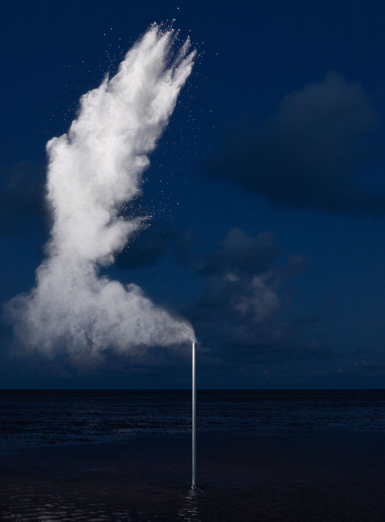 In a similar way as with Lunacy, I had not yet settled on the technique when arriving on Föhr. I was still thinking about how to disperse the chalk I was going to use into the sky, so I brought a lot of different structures with me. I had a plan of creating some sort of a wind-powered machine. What happens quite often in my work is that I do too much, before breaking it down and realizing what’s just surplus. Thus, with In Elements, I went from trying to build all these machines to just using a pipe. Then I thought I needed perfect weather conditions, because I had this picture in my head. Obviously, it never works like that. When I settled on the technique of the pipe shooting calcium carbonate up in the air, me and my assistant went every morning, afternoon, and evening to different parts of the island to repeat the experiment. What we had in the end were less favorable conditions, which actually added to the photographs.