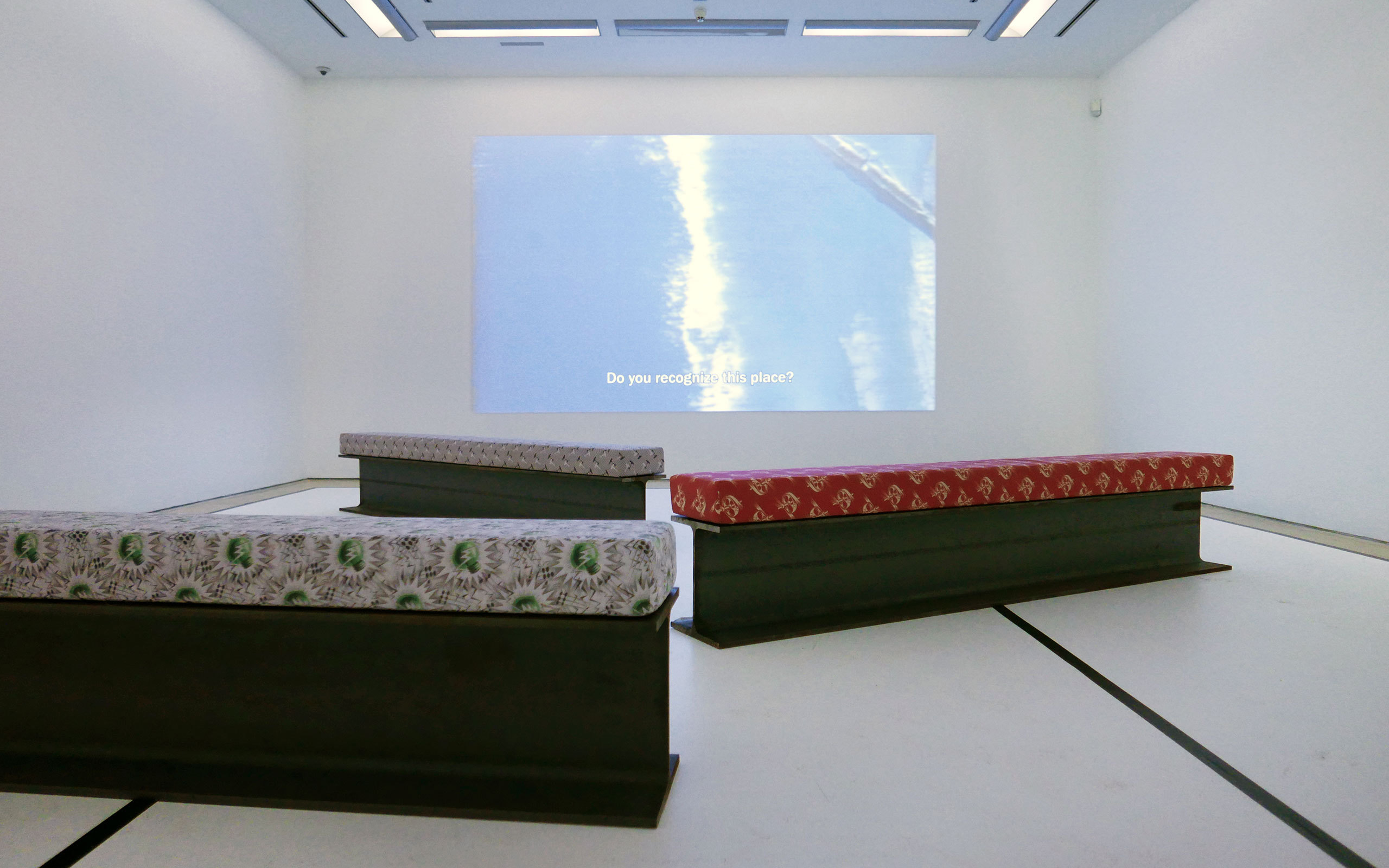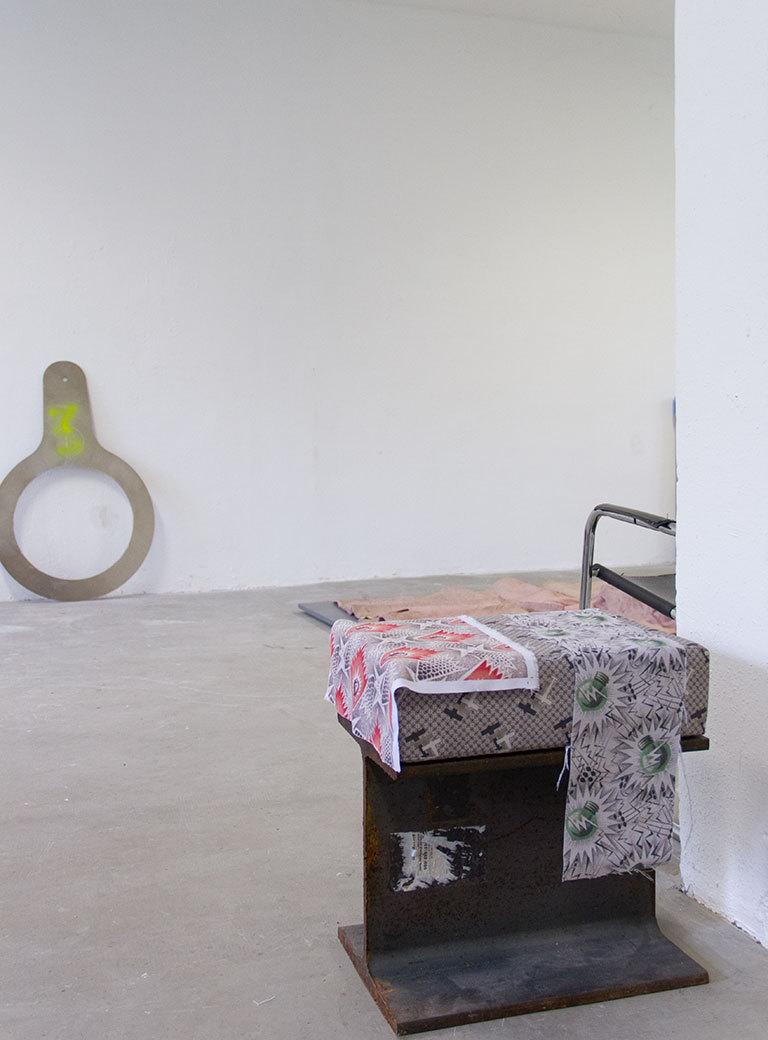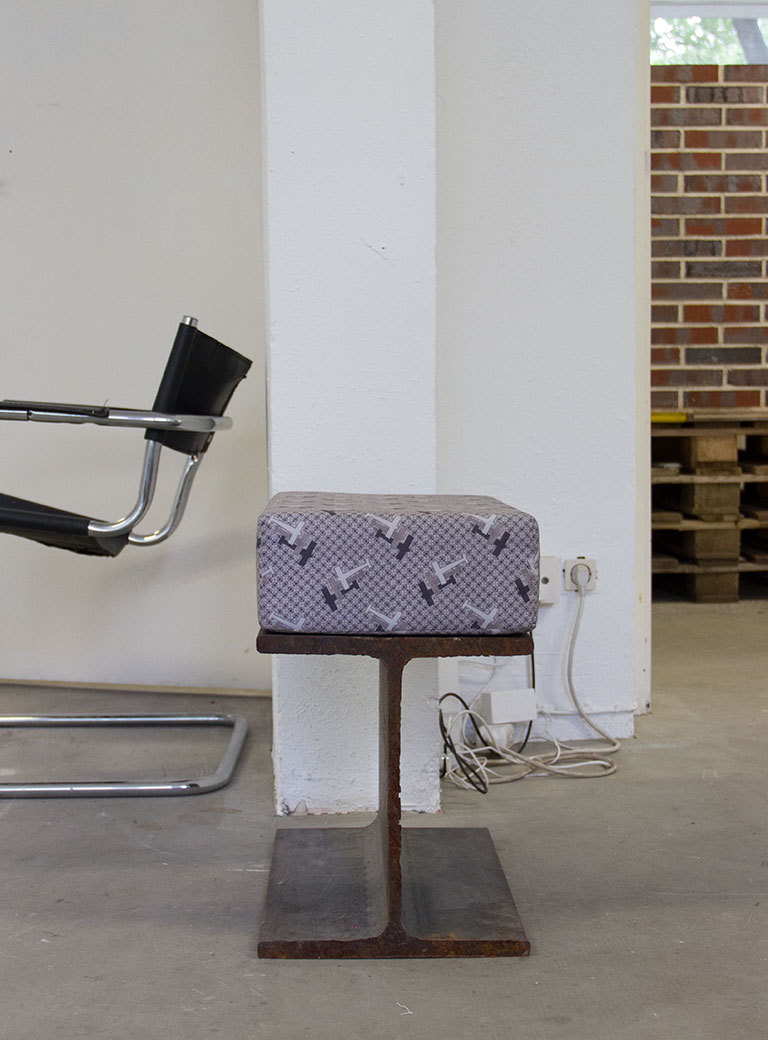 The work has a very strong component that refers to the city of Iwanowo and deals with the declining textile industry there. I found old fabrics bearing propaganda messages that had been produced there in the 1920s and 1930s and had found their way as cheap goods into many Soviet households. The avant-garde design was a means to disseminate messages regarding politics, progress, the military, electricity, and space travel into everyday lives. I have reproduced some of these historical designs myself using a heavy material from the construction industry to cushion I-beams. This seemed to me an exciting combination by which material of our built environment is combined with a form of pictorial ideological charge of this reality.