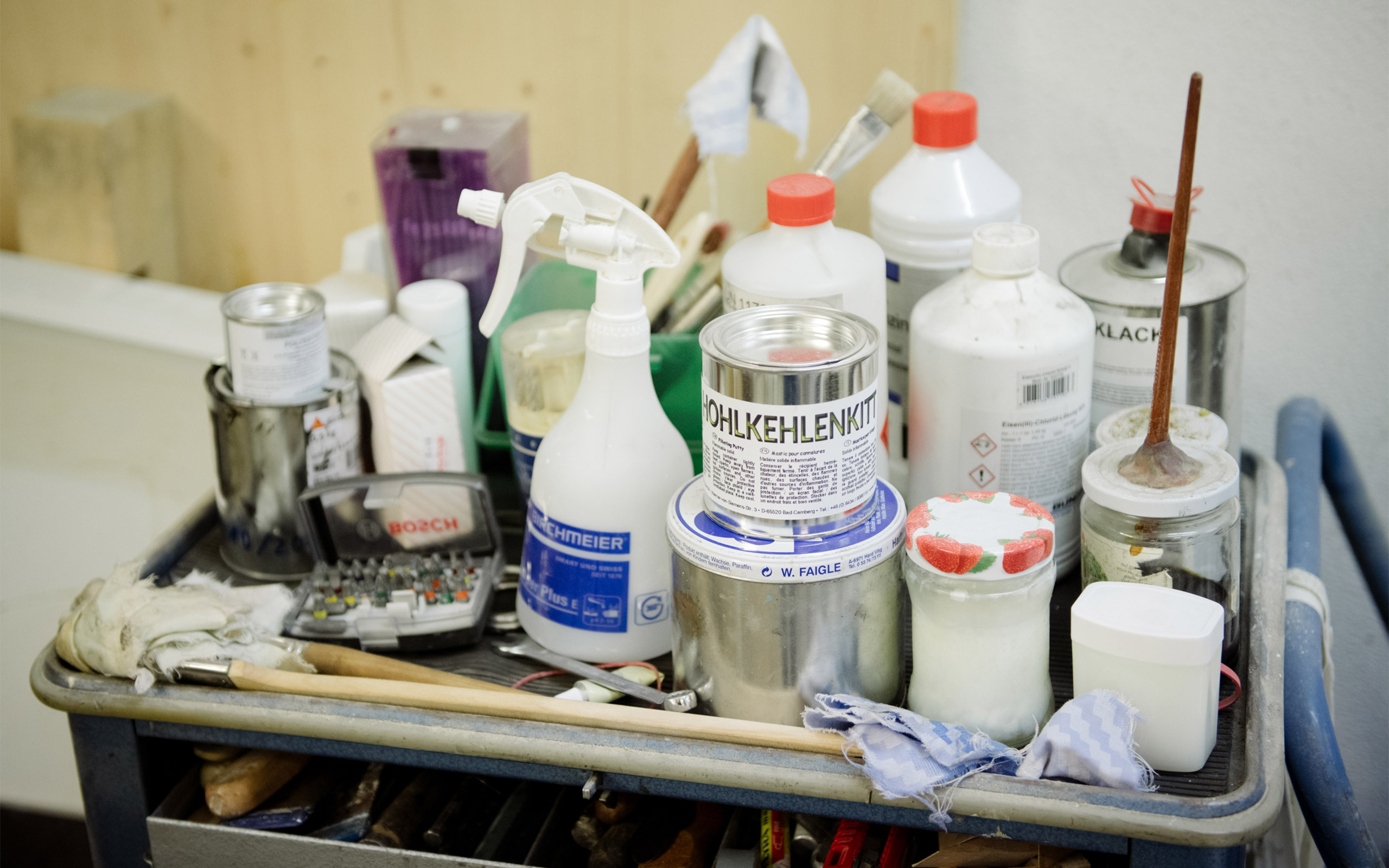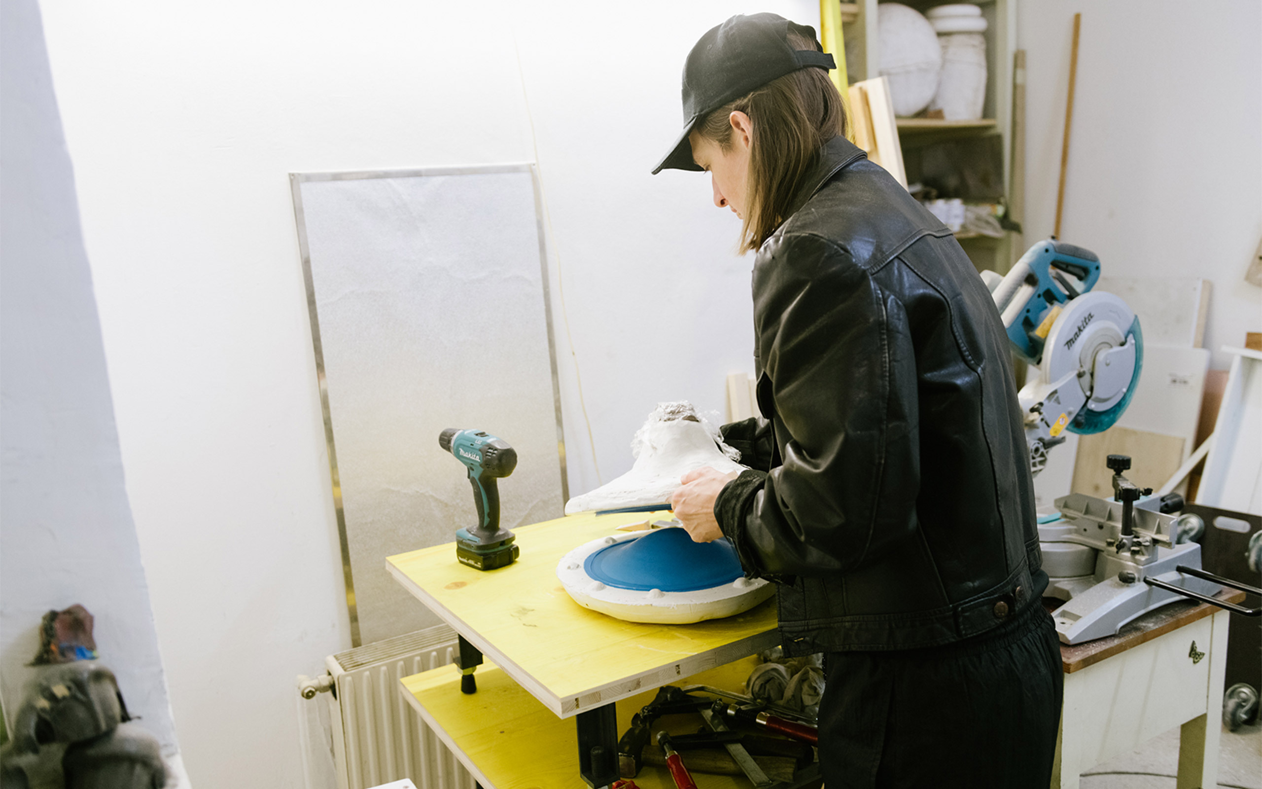 I've been here in this studio since 2013, and I consider myself very fortunate to be able to make noise without objection. So far, there hasn't been any trouble with the neighbors at all. From time to time there is nightly activity, but nobody has ever complained about noise. That is the first point that is important to me, in addition I have the space arranged in the way I feel most comfortable, including this small fitted kitchen I built myself. These sorts of details are very important to me and they are generally reflected in my work. Other than at weekends, I spend my days here from morning until the evening.
